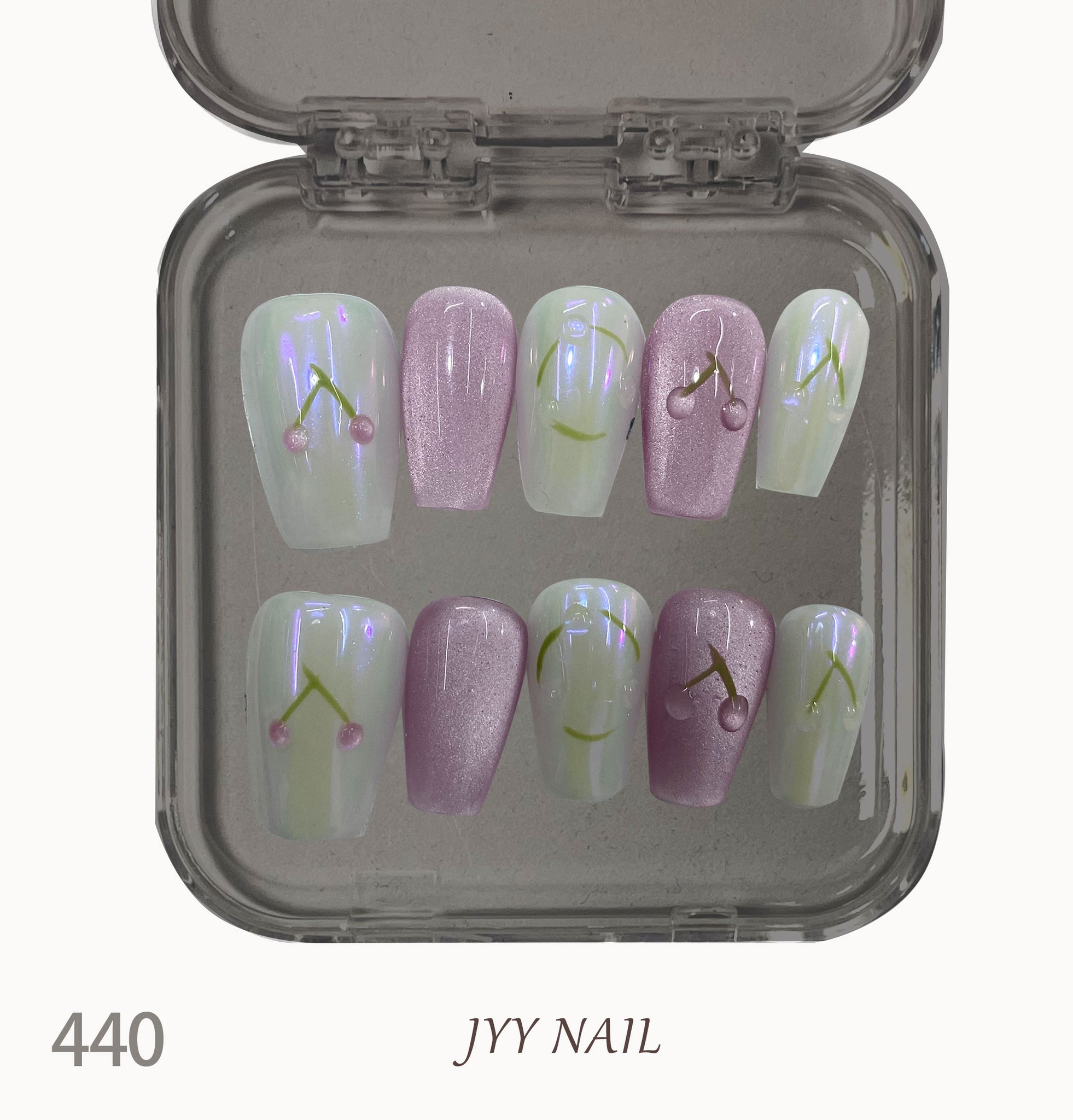 A440 Pink cat's eye cherry:Pink cat eye cherry hand-painted high luxury custom manicure