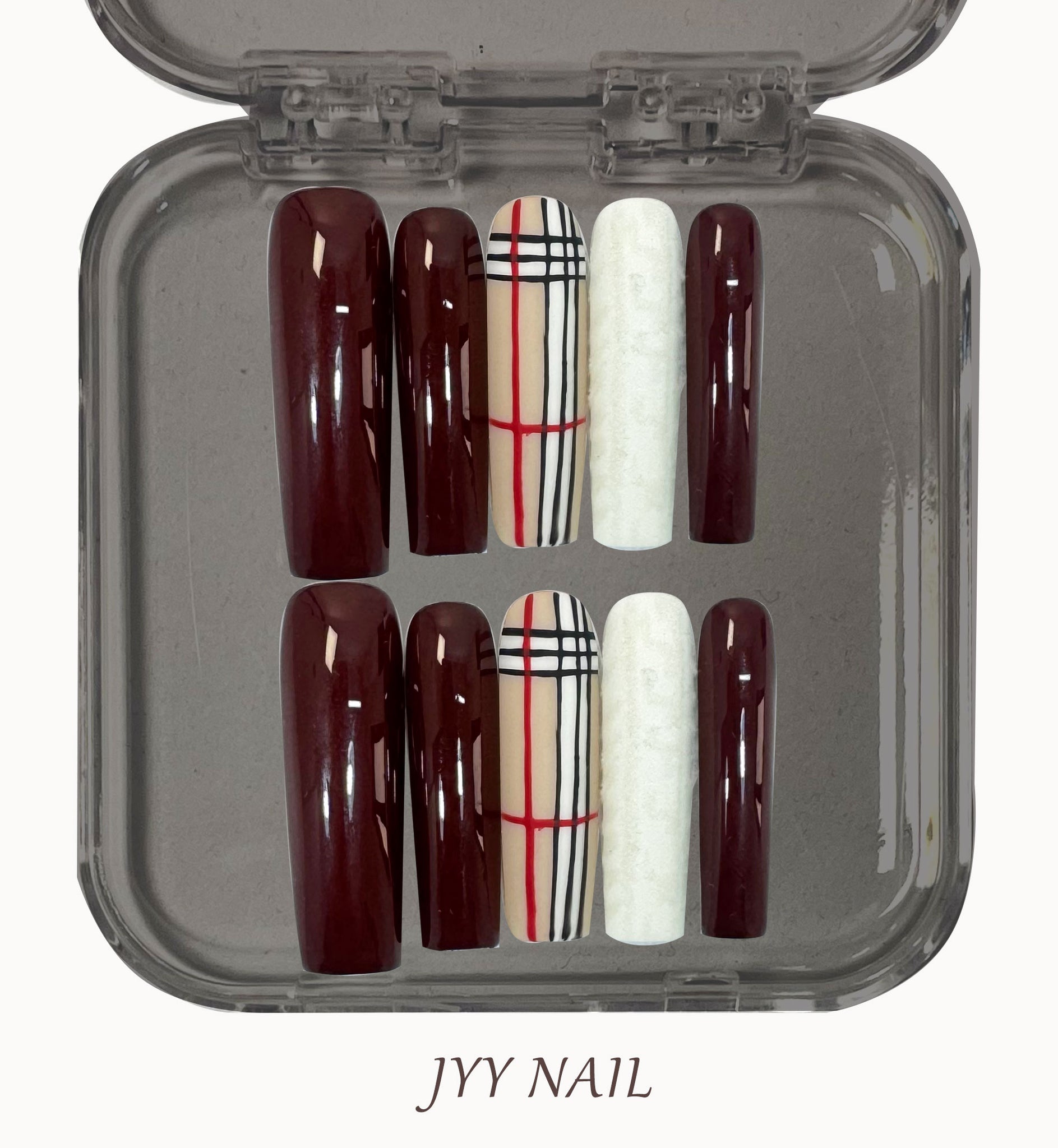 Khaki red check nail is a nail design that combines elements of khaki and red check for a unique visual effect and fashion sense. This manicure design is usually a khaki as the base color, dotted with red plaid pattern, both simple and elegant without retaining personality charm.