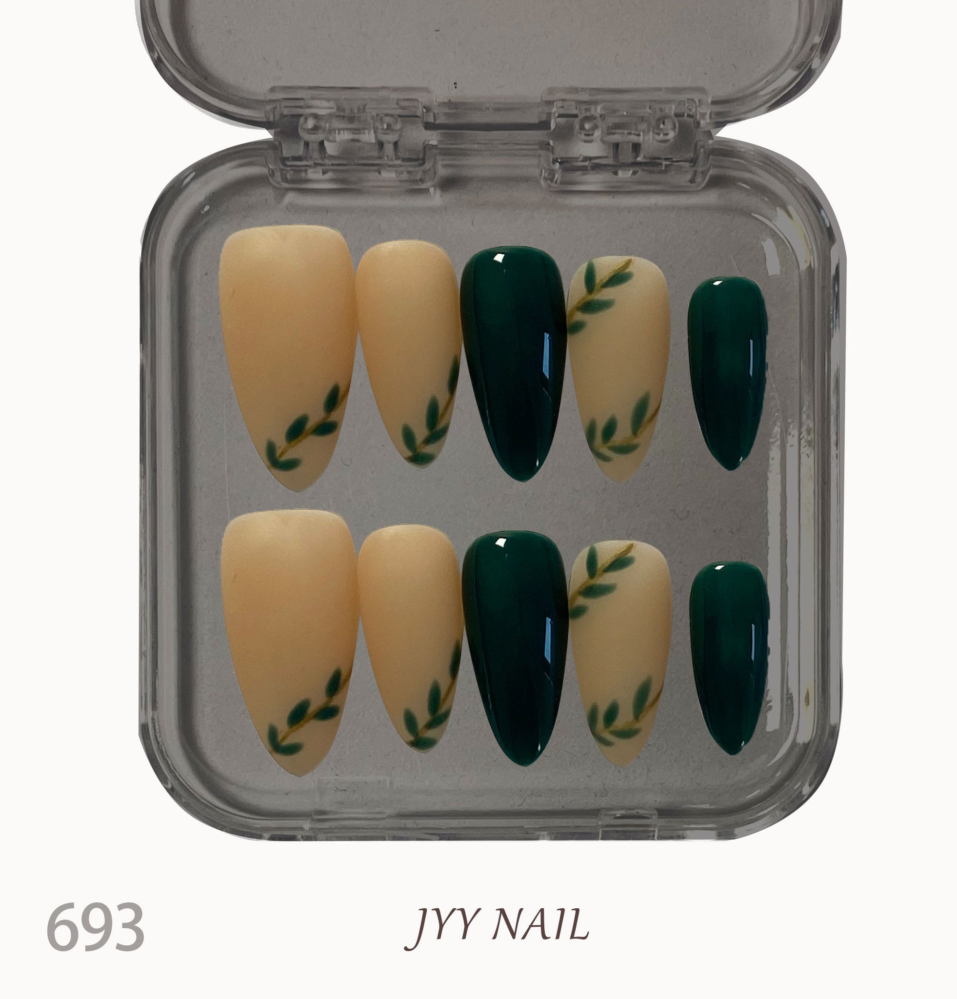 Solid leaf nails are as vibrant as fresh green on a spring morning . For autumn and winter, a white pickle-green nail art is a fashion item in a very special color, brown with a hint of green, giving people a retro and white feel