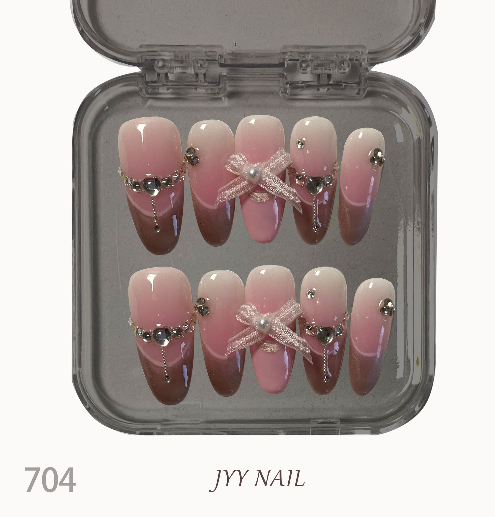 The nail is painted with a French bow design, which is not only elegant, but also has a playful and cute feeling. The bow pattern is full of girly heart, can add to the overall sweet feeling . In addition, the nails are also decorated with brilliant diamonds, the embellishment of these diamonds makes the nails more gorgeous and dazzling, adding a sense of luxury