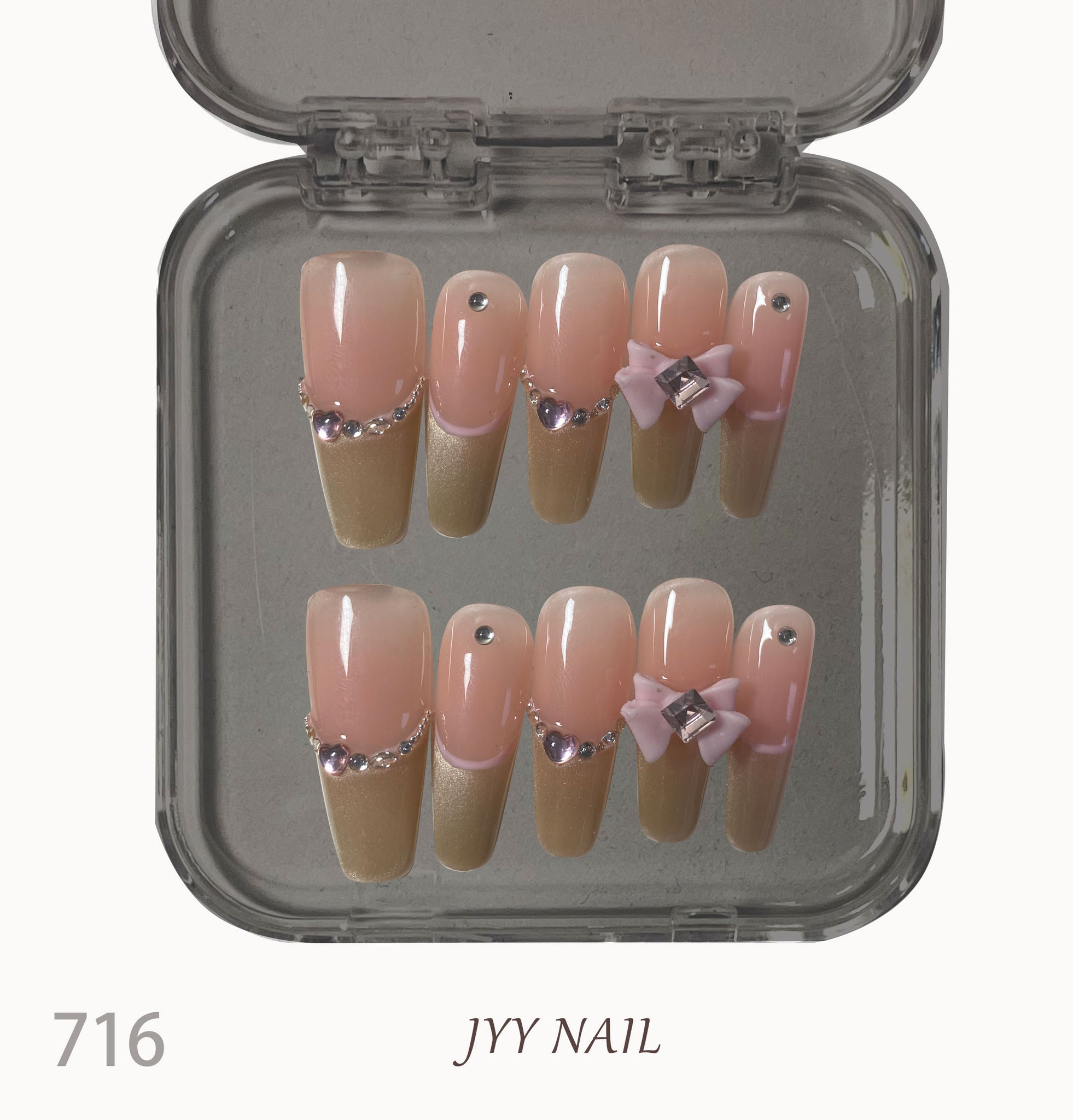 The design elements of the French stick bow nail mainly include the French bevel, the broken diamond and the bow. French bevels add a stylish touch to nails, broken diamonds add luxury, and bows make the overall look more sweet and elegant