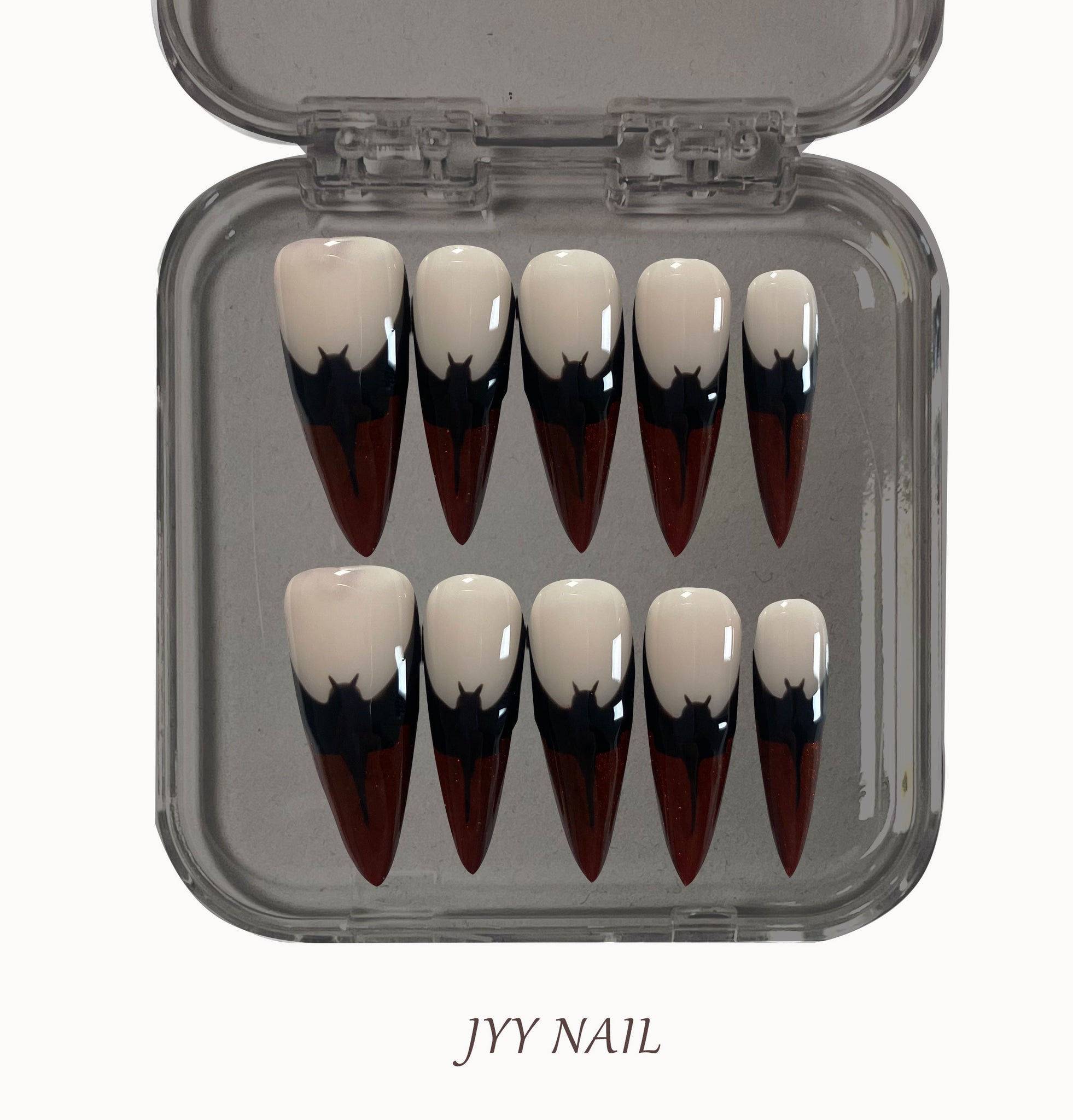 Red Bat nail is a manicure design that combines red and bat elements, usually with a red base color and bat patterns depicted in black or dark colors, creating a mysterious and elegant atmosphere. This nail design is not only suitable for special holidays such as Halloween, but also suitable for everyday wear, showing a unique fashion taste