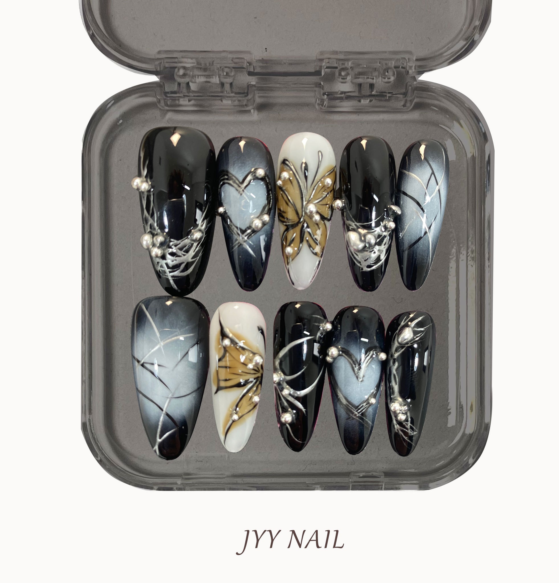 butterfly decoration : Butterflies are an important element in black nail art, usually in three-dimensional or graphic design, to add a clever and romantic atmosphere. The lifelike butterfly makes the entire nail design more vivid and attractive