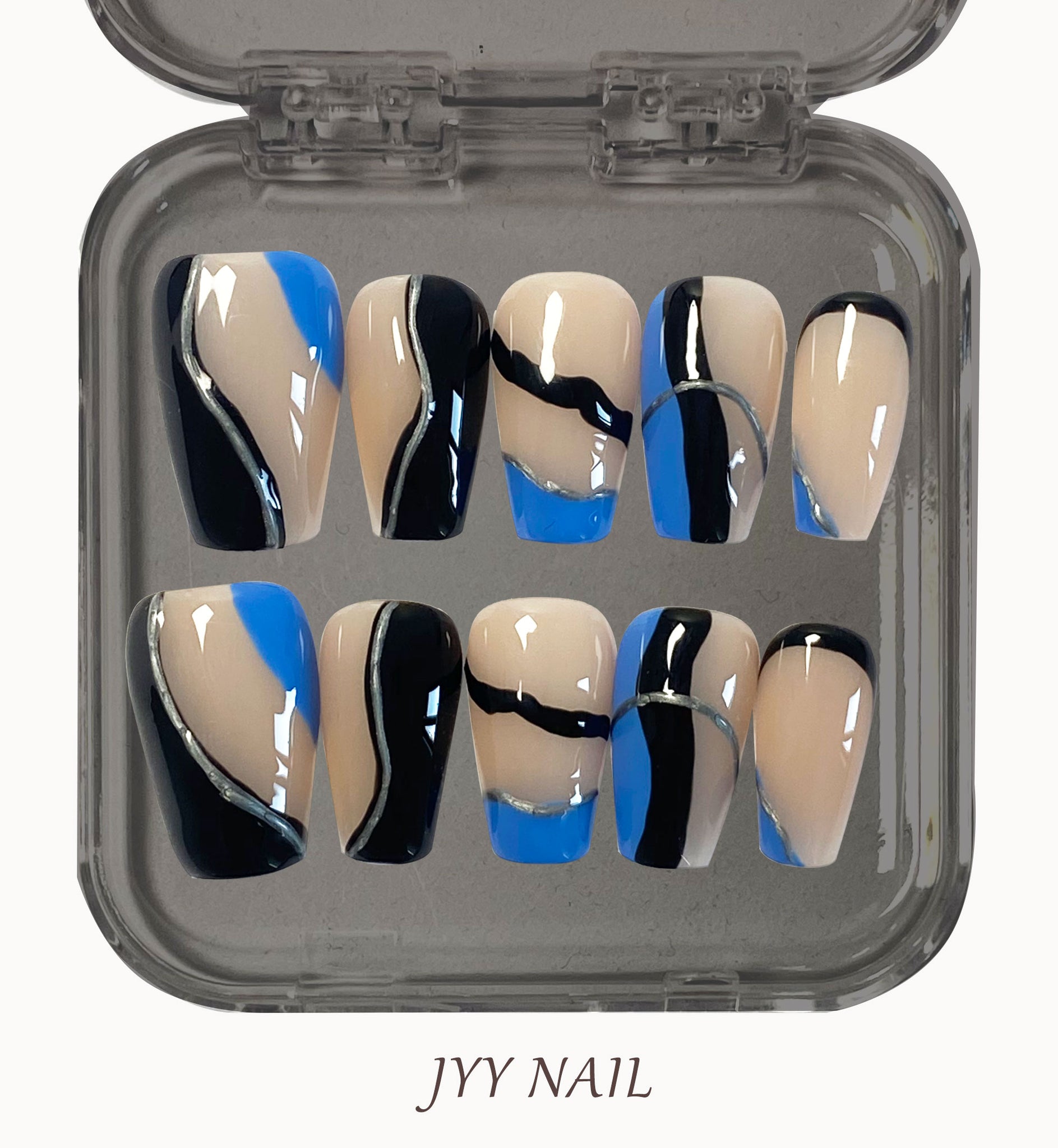 Black and blue manicure is suitable for many occasions, whether it is daily out on the street, to parties or formal occasions, can show a unique fashion charm. Its cool and mysterious style makes it stand out in various occasions and become the focus of attention