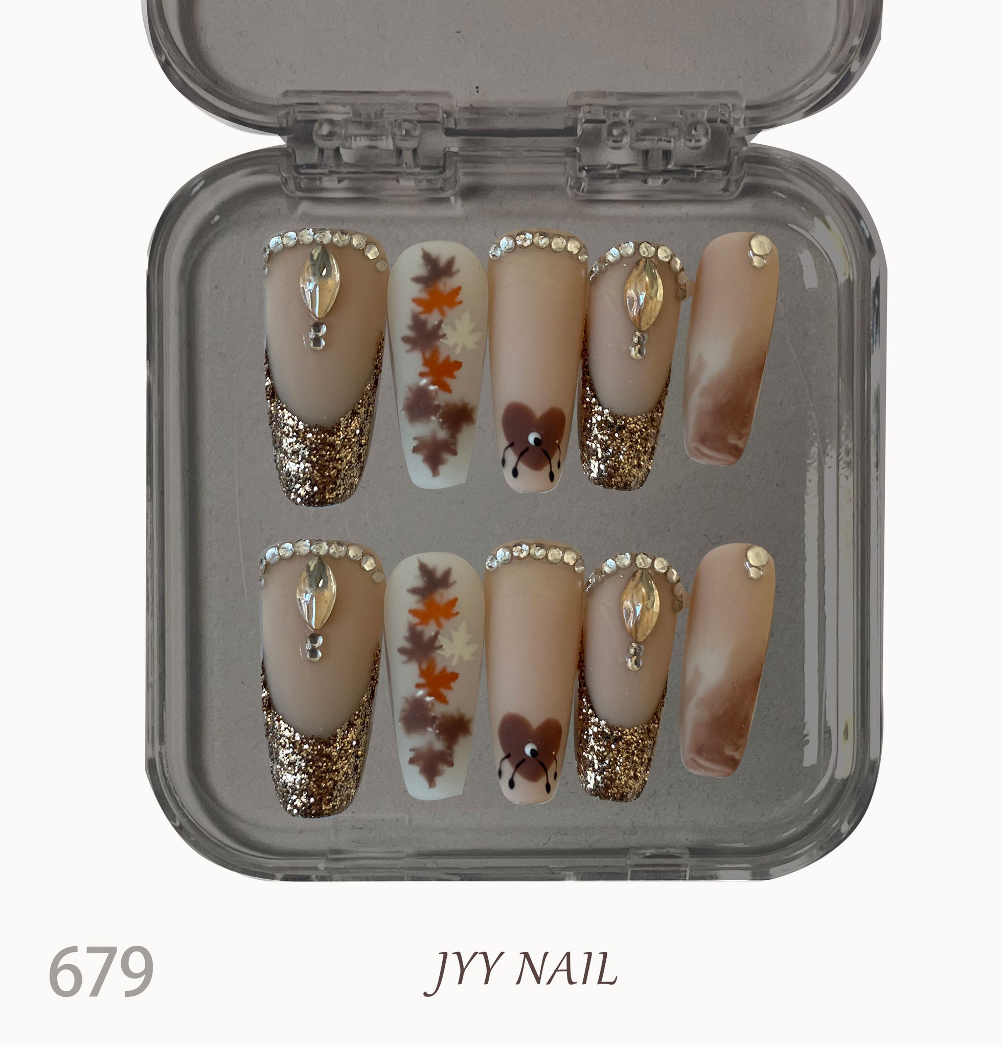 It is often painted in warm hues, such as brown, orange and red, which can well simulate the atmosphere of autumn. The addition of glitter adds shine and detail to the nails, making them shine in the light .